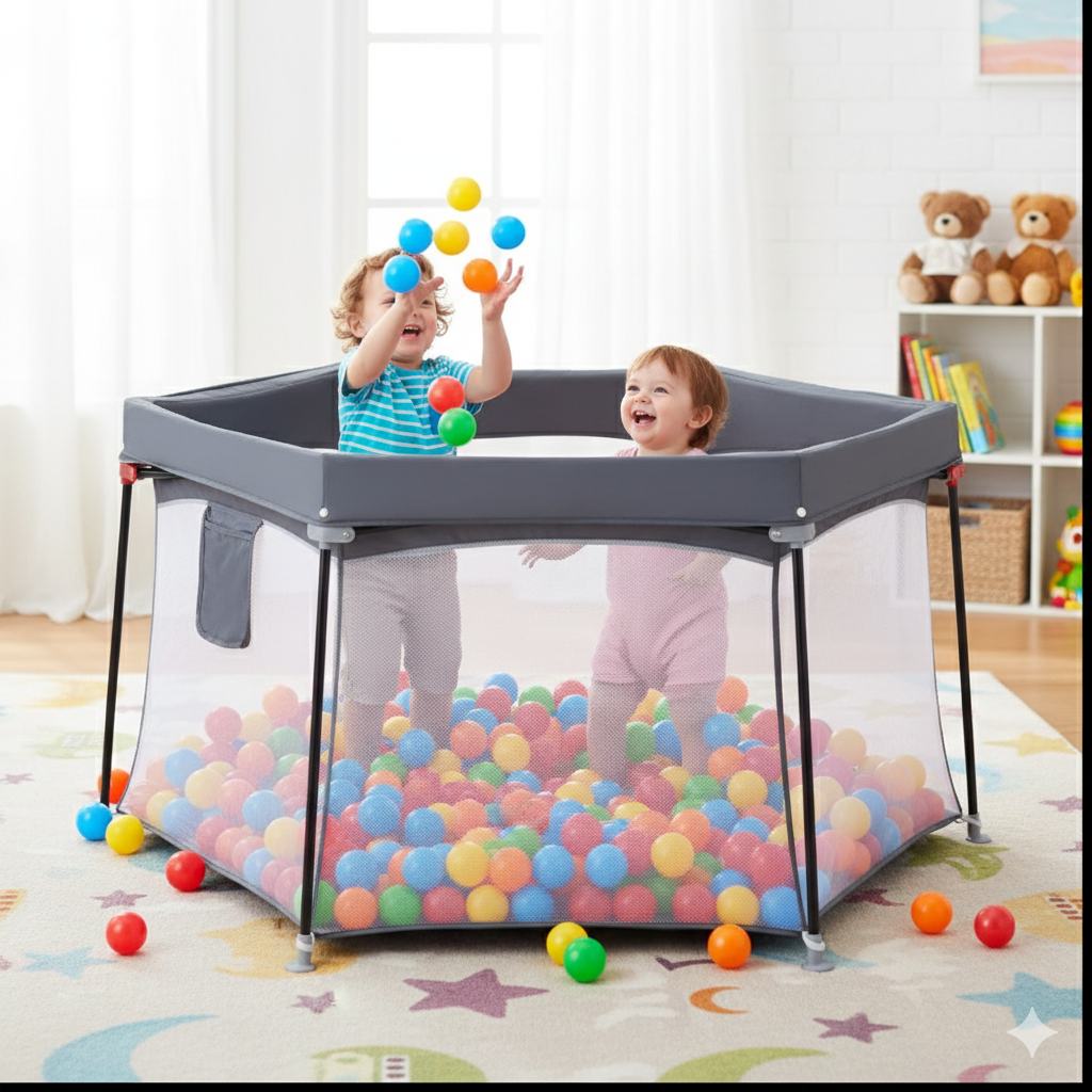 Este robusto parque de juegos hexagonal plegable está diseñado especialmente para proporcionar un espacio seguro donde el bebé puede jugar mientras los padres realizan tareas. Con malla transpirable suave, diseño hexagonal espacioso y construcción plegable, es la solución perfecta para seguridad del bebé, tranquilidad de los padres y versatilidad de uso tanto en interior como exterior.
